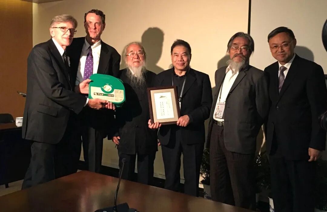 2019年12月13日,邵子平(右二)、陈宪中(右四)和姜国镇(右三)向时任侵华日军南京大屠杀遇难同胞纪念馆馆长张建军(右一)捐赠“37分钟”版马吉影片“一吋盘”。左一、左二为约翰·马吉之孙。 陈旻 摄影